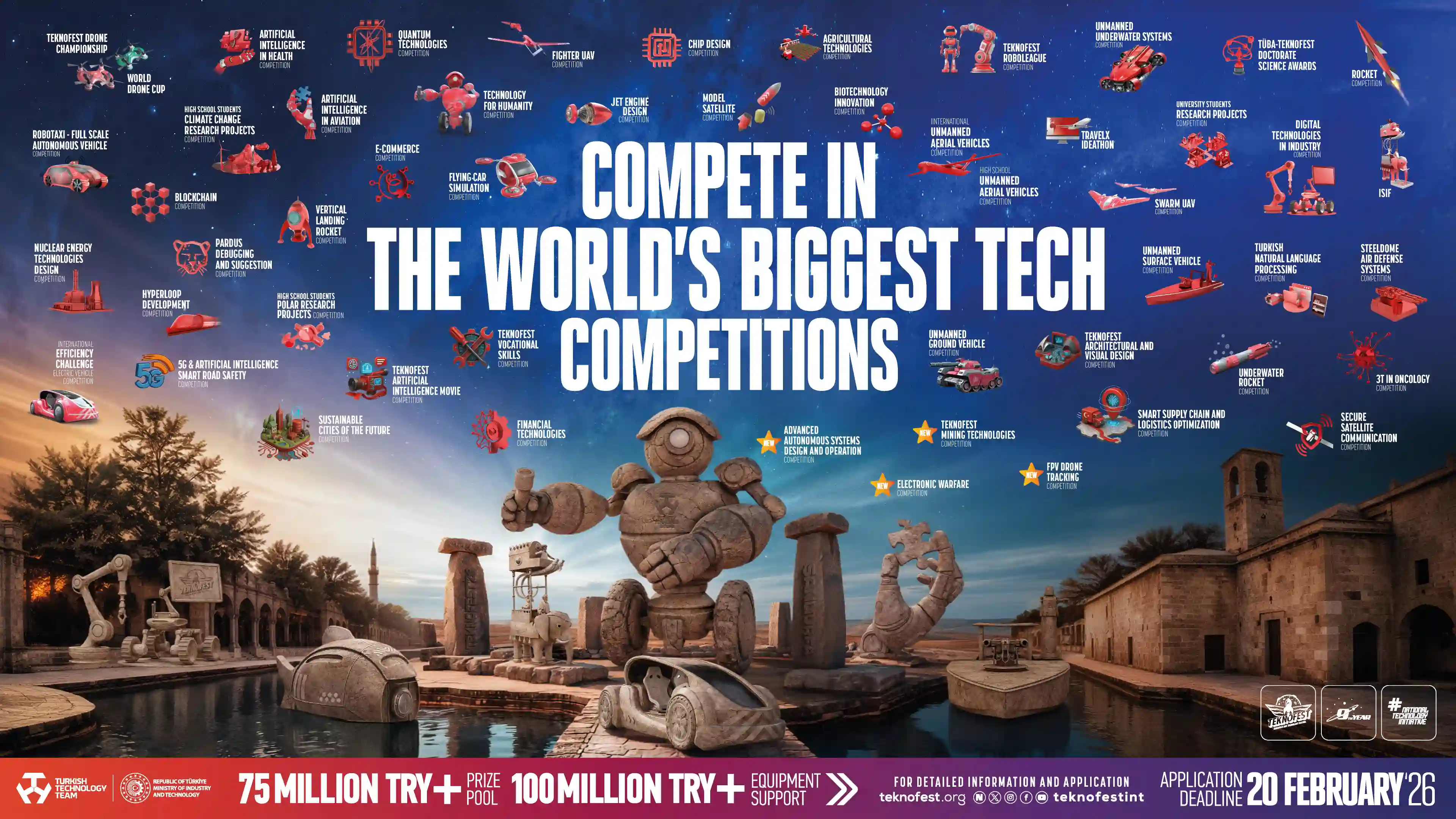 Organized under the leadership of T3 Foundation and the Republic of Türkiye Ministry of Industry and Technology, with the support of Türkiye’s leading technology companies, public institutions, media organizations, and universities, TEKNOFEST—the world’s largest aviation, space, and technology festival—is preparing to meet technology enthusiasts in Şanlıurfa in 2026. To take part in the technology competitions of TEKNOFEST, known as the “festival of firsts” that spreads festival excitement across every corner of the country, you can submit your applications at www.teknofest.org.