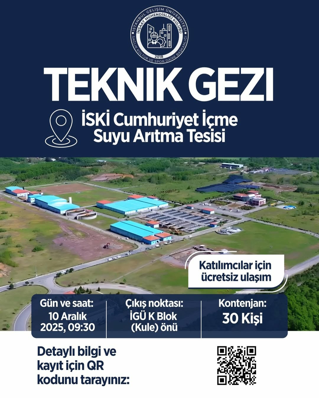 İnşaat Mühendisliği Kulübümüz tarafından 10 Aralık 2025 tarihinde İSKİ Cumhuriyet İçme Suyu Arıtma Tesisi’ne teknik gezi düzenlenecektir.