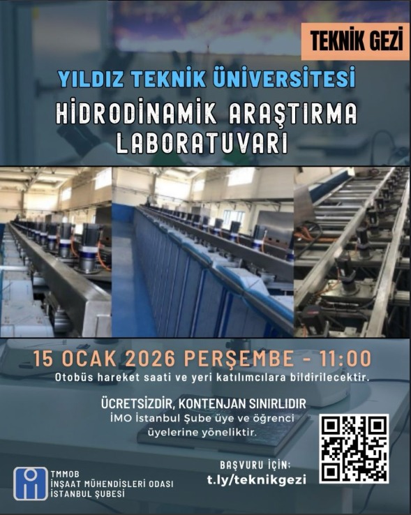 TMMOB İnşaat Mühendisleri Odası İstanbul Şubesi tarafından düzenlenen teknik gezi kapsamında, Yıldız Teknik Üniversitesi Hidrodinamik Araştırma Laboratuvarı ziyaret edilecektir.